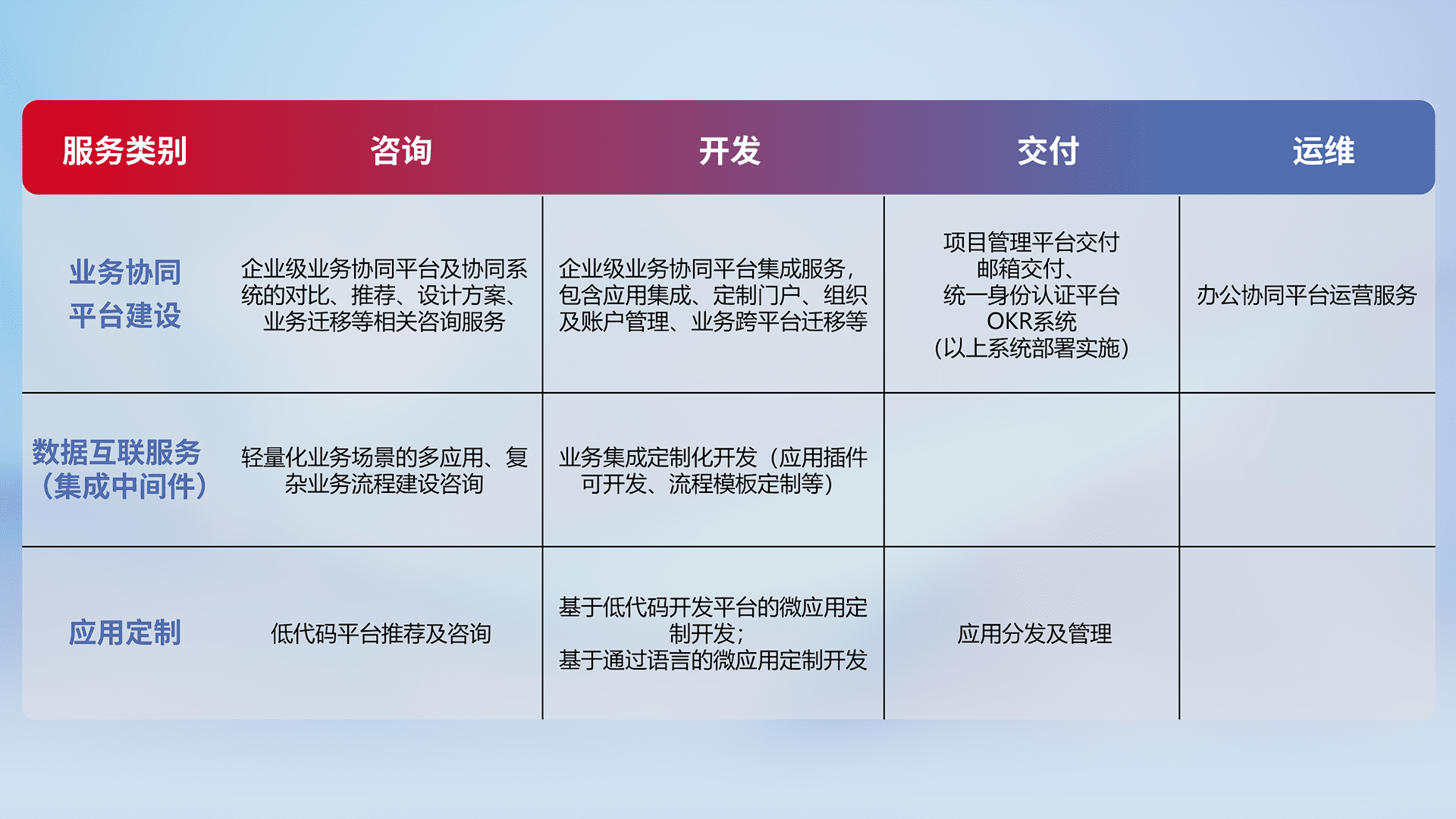 针对钉钉、、、、企微、、IDaas等平台级产品提供产品的规划、、、方案、、、、交付、、定制化开发等服务,,实现如统一协同办公、、智能客户服务、、、、混合会议管理、、、、智能数据查询、、、、等业务场景,,实现数字化转型。。。
